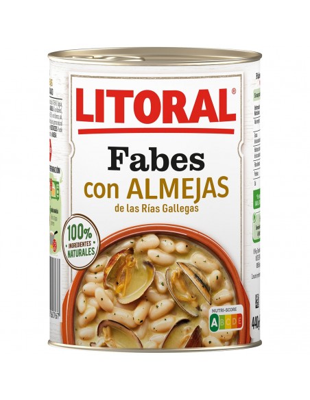 Haricots cuits (47,6%) (eau, haricots 19,2%), eau, palourdes (4 unités), oignon, huile d'olive (2,9%), vin blanc, sel, ail, persil, poivre blanc, laurier, arôme naturel de safran . Sans gluten.